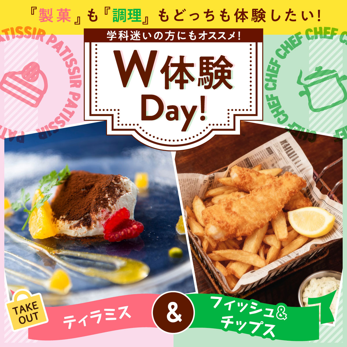 5/4(月·祝)12:00~15:30(受付開始11:30)※2回目〜参加の方は12:00受付開始W体験:ティラミス&フィッシュ&チップス